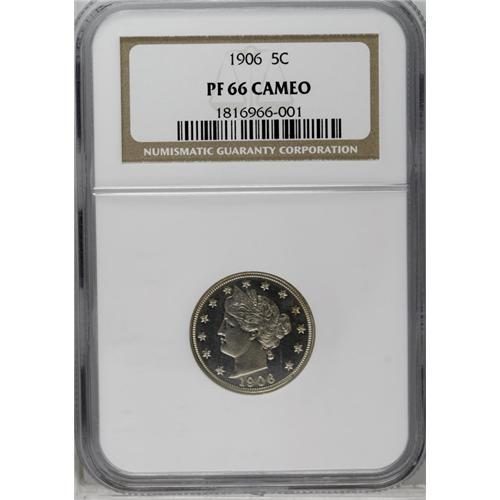 <B>1906<5C> PR66 Cameo NGC.</B></I> This is a stunning Gem proof with excellent contrast. The lustrous devices are fully detailed, and a thin layer of gold patina adds an additional dimension to the presentation.
