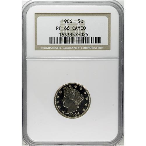 1906 5C PR66 Cameo NGC. This needle-sharp Premium Gem