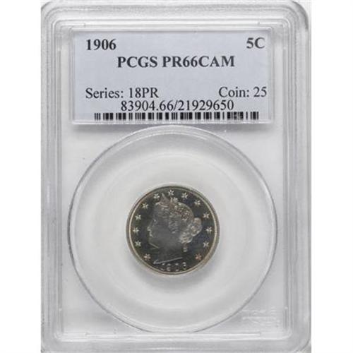 <B>1906 5C PR66 Cameo PCGS.</B></I> A full strike brings up each detail of the richly frosted devices. The surfaces are predominantly golden with both sides showing wisps of deeper tan color. A small handling mark below Liberty's mouth is noted, but it is not distracting. Population: 16 in 66 Cameo, 13 finer (11/07).<BR><BR><b>Shipping:</b> Coins & Currency (<a target="_blank" href="http://www.heritageauctions.com/common/shipping.php">view shipping information</a>)