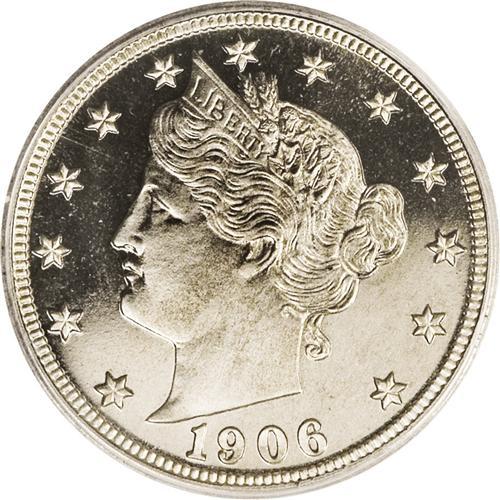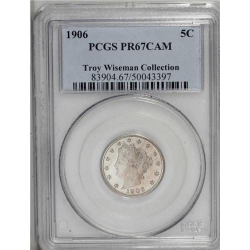 <B>1906<5C> PR67 Cameo PCGS.</B></I> A nearly untoned black-on-white specimen, with a faint suggestion of golden-red hues in the centers. The star centrils, Liberty's hair, and that pesky left ear of corn are all bold on this fully struck piece. The generous, glacial frost on the devices is an obvious plus. Population: 11 in 67, 1 finer (8/06).<BR><I>From The Troy Wiseman Collection.</B></I>