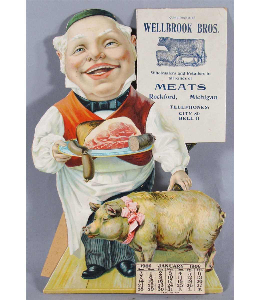 1906 Easel Back, Embossed Die Cut Calendar for Wellbrook Bros. Meats, Rockford, Michigan. Full pad, near mint condition. 7 3/4 X 11 1/2 inches.