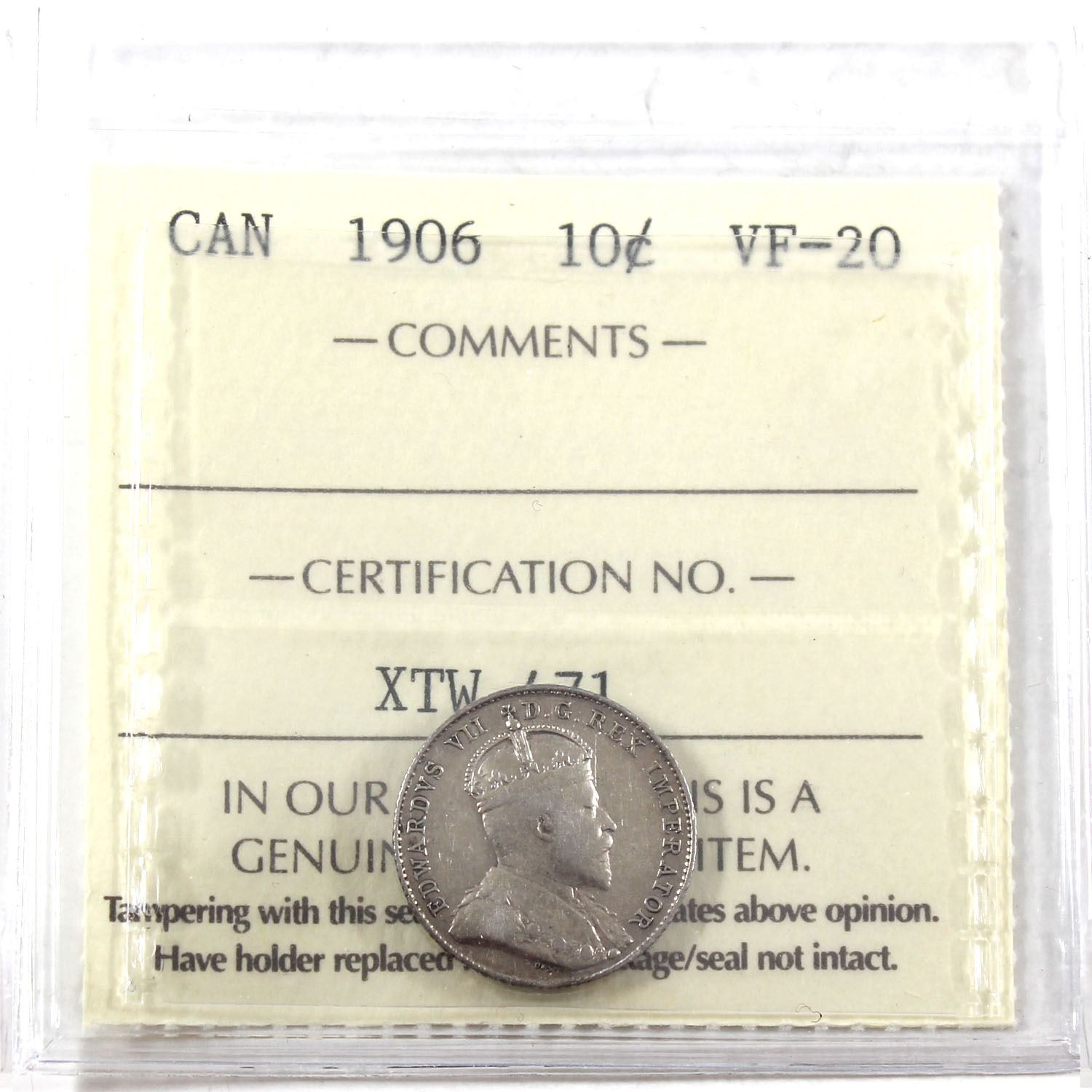 1906 Canada 10-cents ICCS Certified VF-20