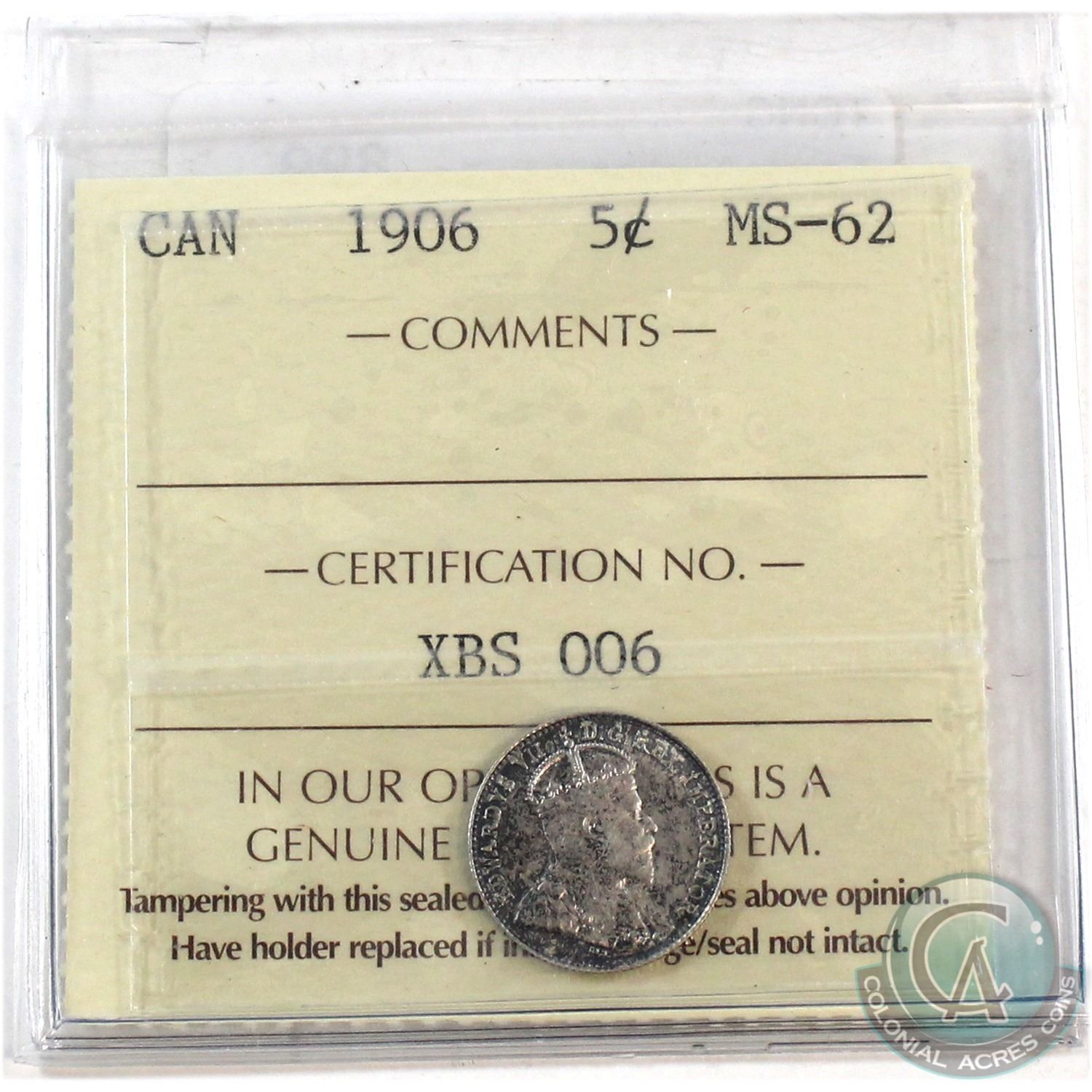 1906 Canada 5-cent ICCS Certified MS-62