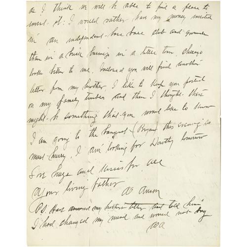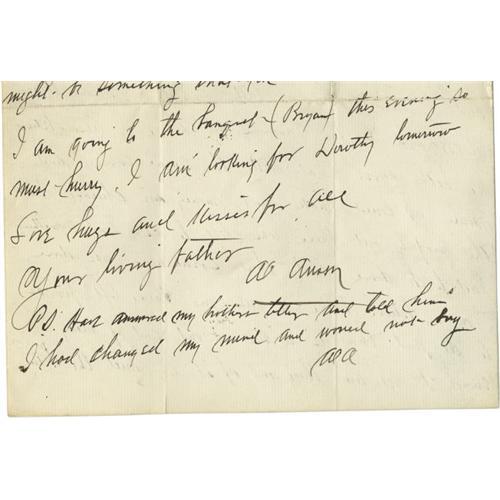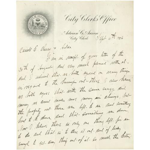 <B>1906 Cap Anson Handwritten Letter.</B></I> He has been aptly called "baseball's first superstar," compiling over 3,000 hits in twenty-seven seasons of baseball and inspiring fellow Chicago resident Charles Comiskey to exclaim, "He was the greatest batter that ever walked up to hit at a baseball thrown by a pitcher." The 1939 posthumous Hall of Fame inductee passed from this life in 1922, making examples of his autograph a tough find for collectors. Here we present a fine handwritten letter, penned on Anson's Chicago City Clerk stationery. On both sides of the page he writes a long message to his son, noting at point, "I would rather have my money invested in an independent base ball club and grounds than in a brick business in a little town. Chicago looks better to me." He signs off, "Love, hugs and kisses for all, Your loving father Al Anson." A brief postscript follows, which he initials "Al A," effectively adding a second signature to this remarkable piece. Ink quality remains a marvelous 10/10 in boldness, while the letter shows expected wear along the original mailing folds but is otherwise very strong. <I>LOA from PSA/DNA.</B></I> <BR><BR><B>Important notice:</B> Heritage usually auctions material at the rate of 200-250 lots per hour. On some occasions eBay Live bid software or the Internet may not be able to keep up with the pace of the auction. We recommend placing a realistic absentee bid now as insurance to avoid disappointment. Occasionally the auctioneer may eliminate or reject an eBay Live bid, and the auctioneer may also reopen a lot after the close of the eBay live bidding (usually because we missed an audience bid), and may reject your bid even if it shows you as the winning bidder. By bidding via eBay Live, you agree that Heritage may award the lot to another bidder at its sole discretion under the circumstances described above or any other reasonable circumstances. Since eBay bids are not shown to us until we open the lot on the floor, we treat those bids just like floor bids. In most cases the floor responds before the eBay bid is presented to us, due to Internet lag time, so for consistency we have made it a policy that floor bids are always considered first over tie eBay live bids. Also please note that all Heritage lots purchased through eBay Live carry a 22.5% Buyer's Premium. Please make sure you read the Terms and Conditions before you bid. This lot is being auctioned in conjunction with a live floor auction by Heritage Galleries & Auctioneers. All final auction and invoice information will be supplied by Heritage Galleries & Auctioneers, and all other information should be considered preliminary. Lot:19049 <BR><BR><B>Winning Notification and Billing:</B> After the FINAL session in this auction is complete, Heritage will send e-mail and snail mail invoices. This process normally takes several days. All final auction and invoice information will be supplied by Heritage Galleries & Auctioneers, and all other information should be considered preliminary. <BR><BR>This auction will be conducted on a live auction floor and over the Internet through eBay Live. If you choose to place an absentee bid, please take a moment to <font color='#0000ff'><u><a href='http://pages.ebay.com/liveauctions/help/before/laabsentee.html'>learn how eBay Live absentee bidding works</a></u></font><font color='#000000'>