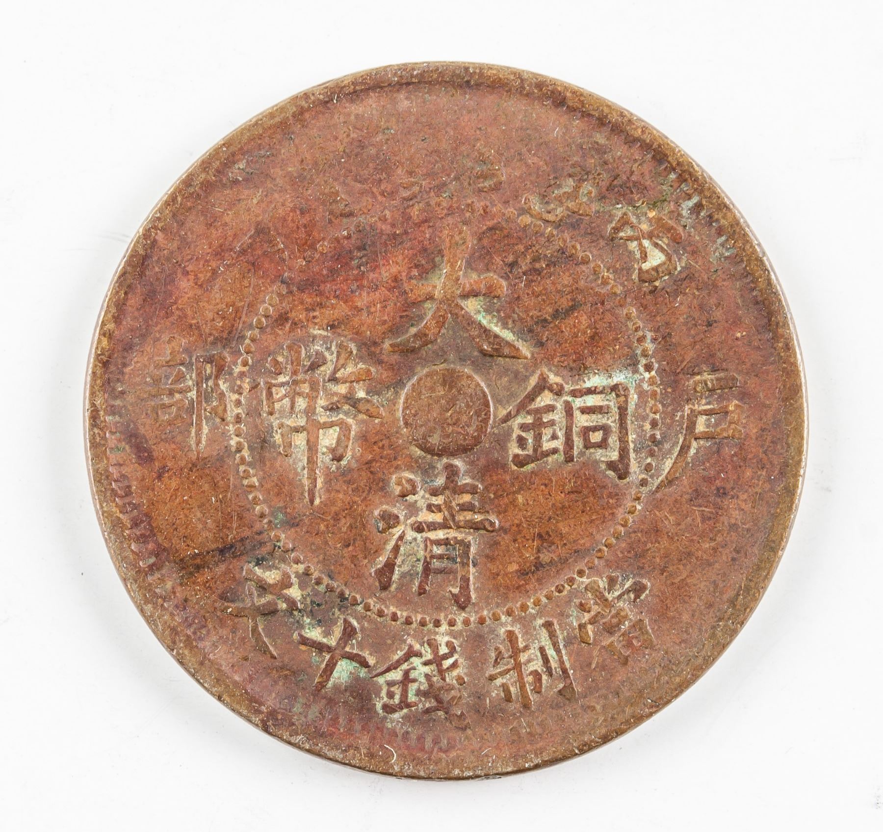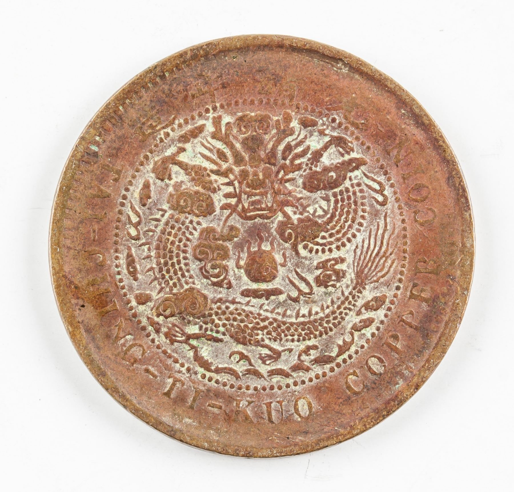 1906 Chinese 10 cash copper coin; Hu Peh mint; obverse lettering Da Qing Tong Bi, E, Bing Wu, Hu Bu, Dang Zhi Qian Shi Wen; reverse engraved dragon, lettering Guang Xu Nian Zao, TAI-CHING-TI-KUO COPPER COIN; smooth edge; Y-10; similar one sold $717 at SB in 2012; D: 28.84 mm, T: 1.50 mm, 7.274 grams
