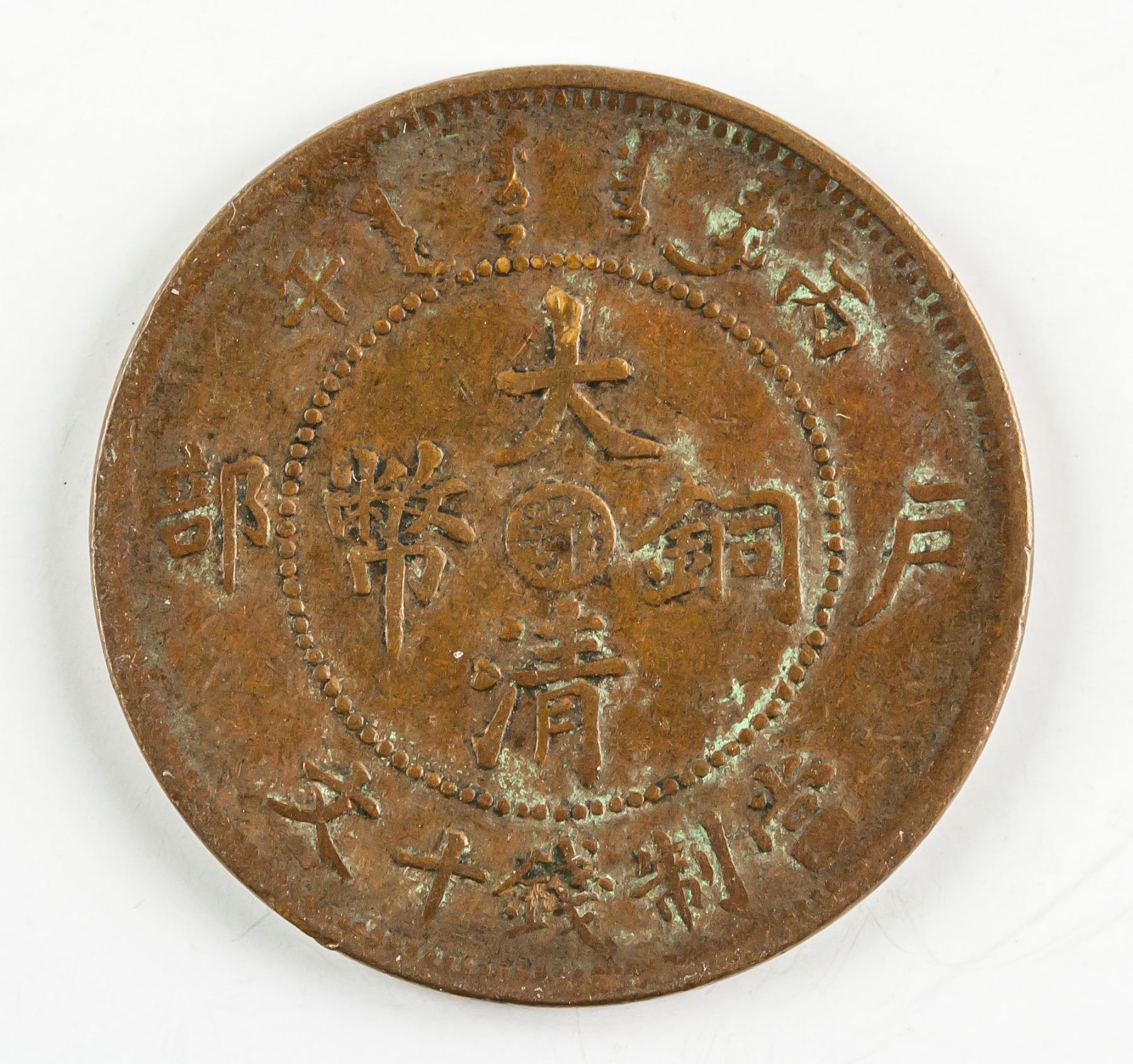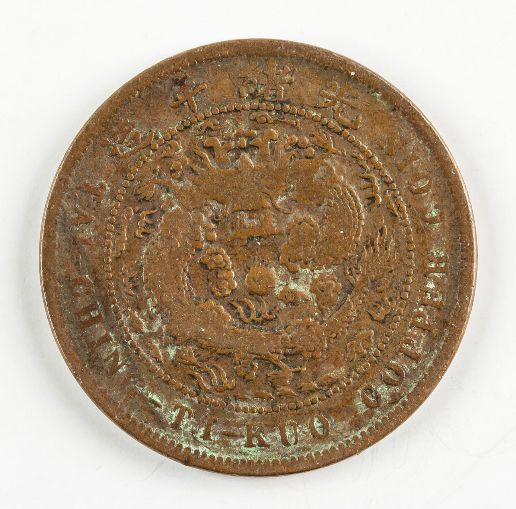 1906 Chinese 10 cash copper coin; Hu Peh mint; obverse lettering Da Qing Tong Bi, E, Bing Wu, Hu Bu, Dang Zhi Qian Shi Wen; reverse engraved dragon, lettering Guang Xu Nian Zao, TAI-CHING-TI-KUO COPPER COIN; smooth edge; Y# 10; similar one sold $717 at SB in 2012; D: 29 mm, T: 1.5 mm, 7.475 grams