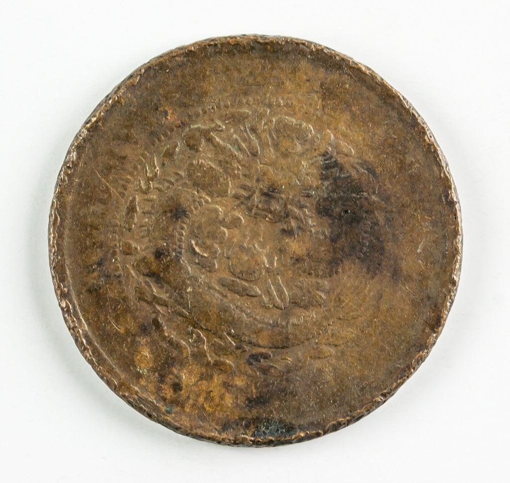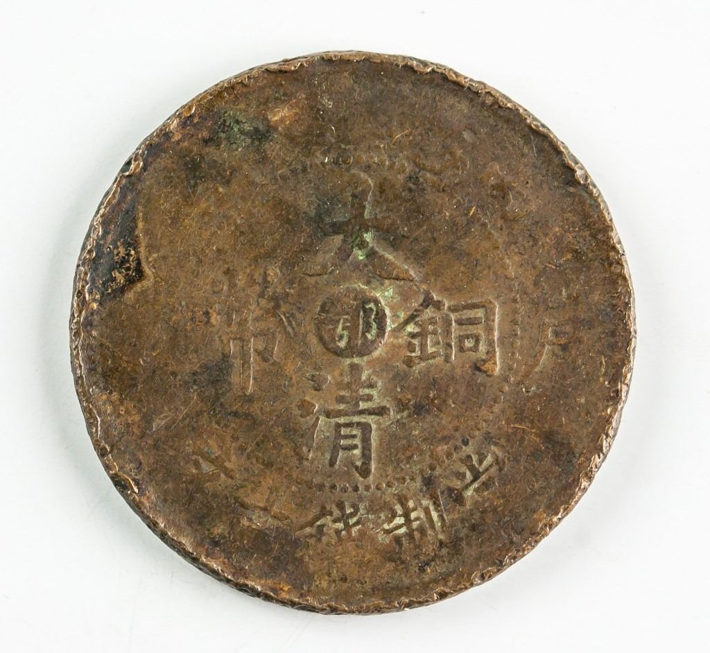 1906 Chinese 10 cash copper coin; Hu Peh mint; obverse lettering Da Qing Tong Bi, E, Bing Wu, Hu Bu, Dang Zhi Qian Shi Wen; reverse engraved dragon, lettering Guang Xu Nian Zao, TAI-CHING-TI-KUO COPPER COIN; smooth edge; Y# 10; similar one sold $717 at SB in 2012; D: 28.70 mm, T: 1.78mm, 7.508 grams