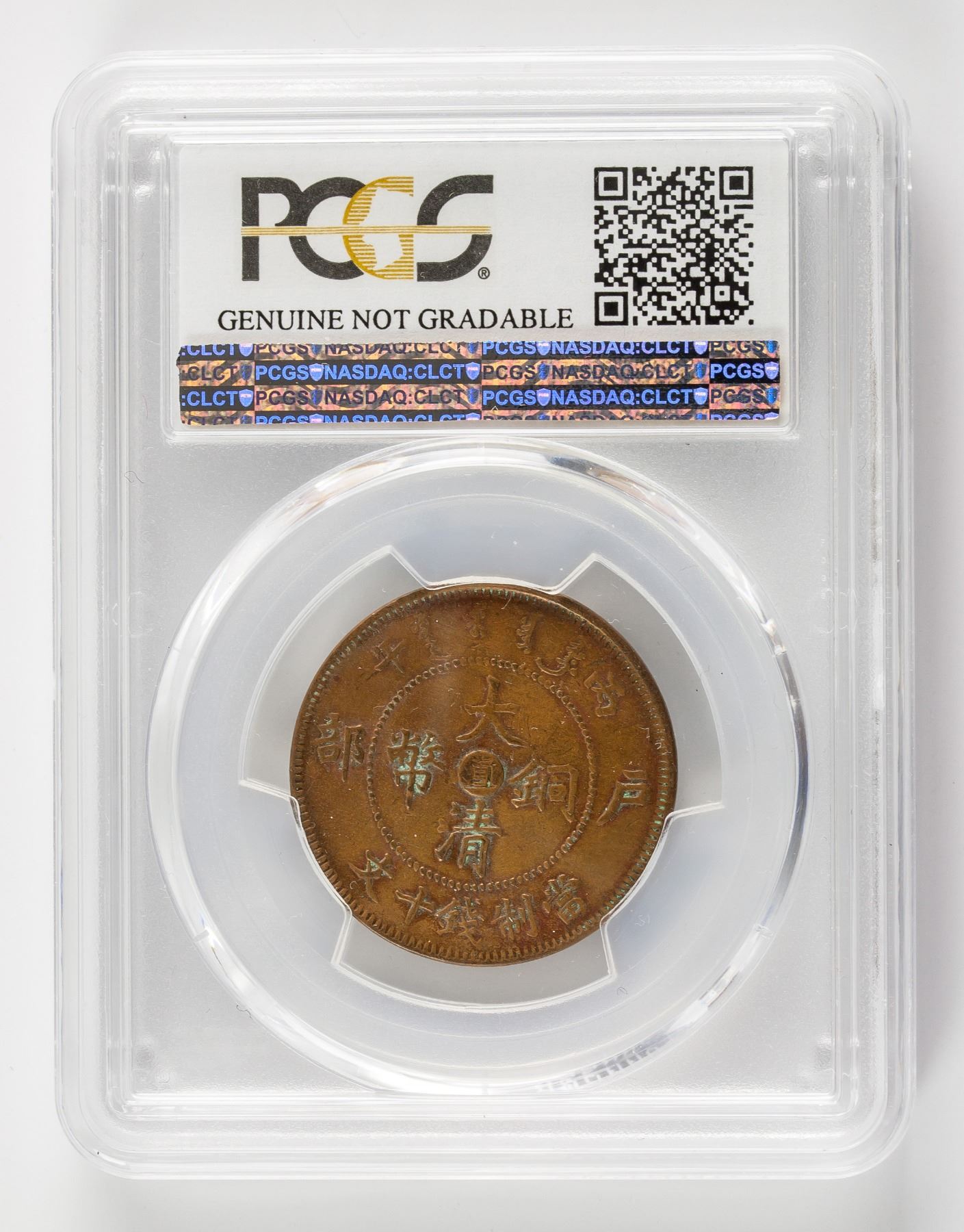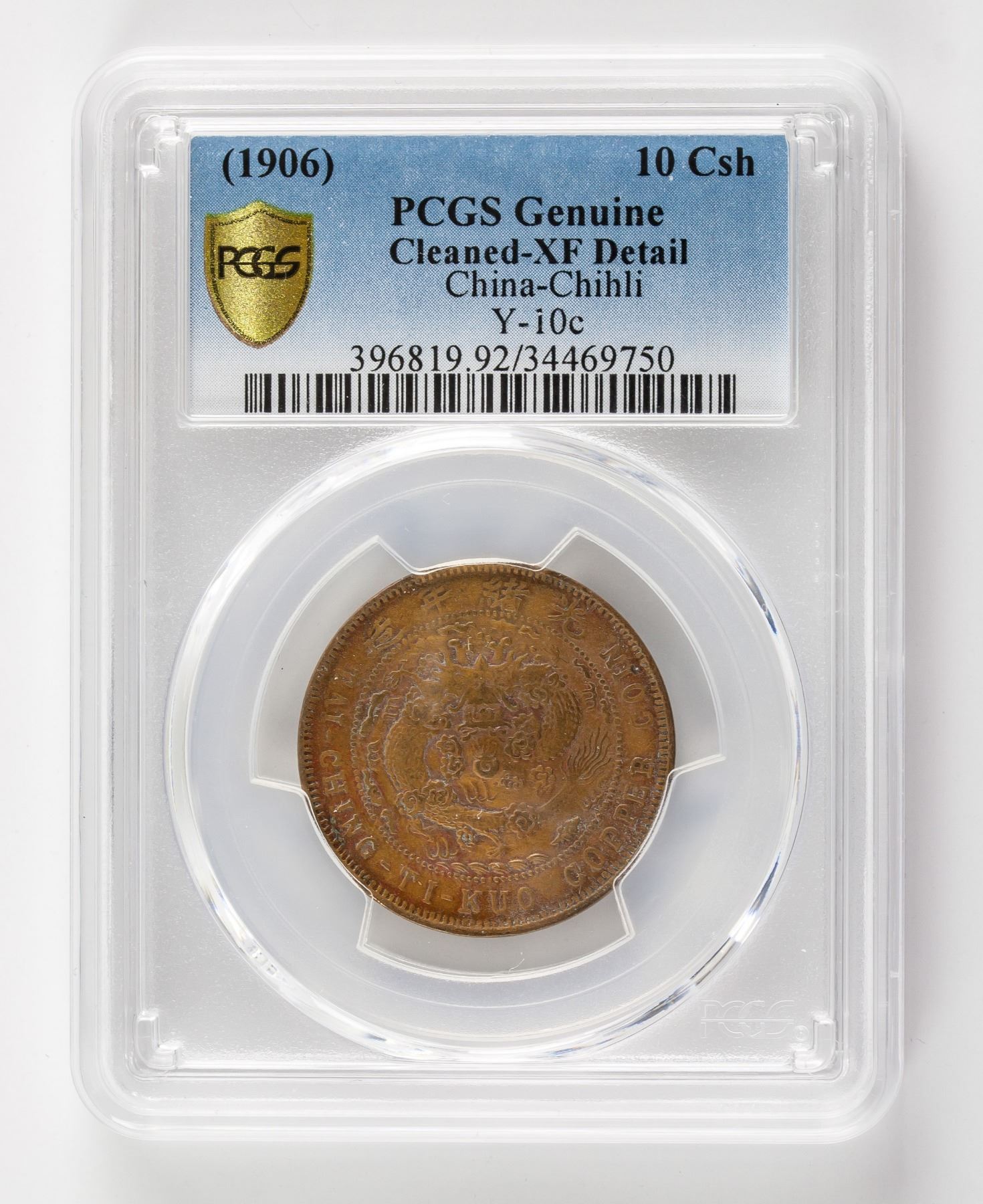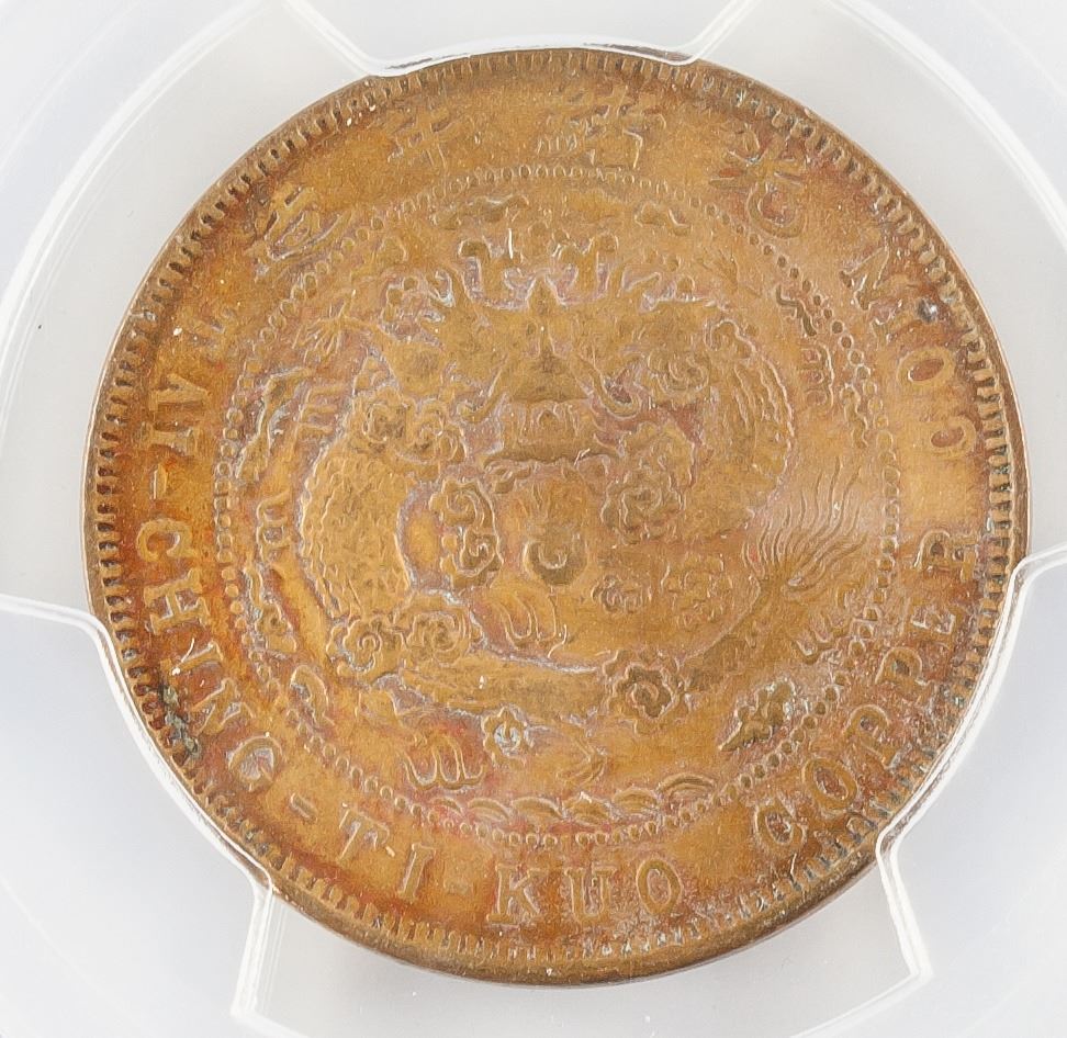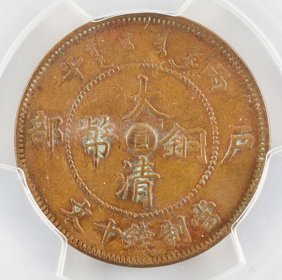 1906 Chinese Qing dynasty Daqing Tongbi 10 Cash copper coin, Chihli Hubu mint, obverse lettering Da Qing Tong Bi, Bing Wu, Hu Bu, Zhi in middle, Dang Zhi Qian Shi Wen, reverse engraved dragon, lettering Guang Xu Nian Zao, TAI-CHING-TI-KUO COPPER COIN, Y-10c, PCGS graded, cleaned, XF detail, certification number 396819.92/34469750, D: 27.61 mm