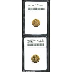 <TABLE cellSpacing=0 cellPadding=0 width="100%" bgColor=#000000 border=0><TBODY><TR><TD width="100%"><TABLE cellSpacing=1 cellPadding=3 width="100%" border=0><TBODY><TR><TD width="100%" bgColor=#79735c><FONT face=arial color=#ffffff size=3><B>Description</B> </FONT></TD></TR><TR><TD width="100%" bgColor=#ffffff><FONT face=arial size=2><B>1901 $2 1/2 MS60 ANACS,</B></I> bright luster, golden-brown color, an alloy spot behind the lower hair bun; and a <B>1906--Cleaned--ANACS, Unc Details, Net AU55,</B></I> faint clash marks (as made) near the arrowheads, wispy hairlines in the lower right obverse field. (2 Coins) </FONT></TD></TR></TBODY></TABLE></TD></TR></TBODY></TABLE><BR><A name=PricesRealized></A><TABLE cellSpacing=0 cellPadding=0 width="100%" bgColor=#000000 border=0><TBODY><TR><TD width="100%"><TABLE cellSpacing=1 cellPadding=3 width="100%" border=0><TBODY><TR><TD width="100%" bgColor=#79735c><A name=PR><FONT face=arial color=#ffffff size=3><B>Previous Prices from Heritage Auctions</B> </FONT></A></TD></TR><TR><TD bgColor=#f6f6ed><TABLE cellSpacing=0 cellPadding=0 width="100%" border=1><TBODY><TR><TD align=middle width="33%"><B>Date</B></TD><TD align=middle width="33%"><B>Service</B></TD><TD align=middle width="33%"><B>Price</B></TD></TR><TR bgColor=whitesmoke><TD width="33%"><B>01/06/2001</B></TD><TD width="33%">ANACS</TD><TD width="33%">$207.00</TD></TR></TBODY></TABLE></TD></TR><TR><TD bgColor=#ffffff><FONT face=arial size=1 ?>PLEASE NOTE: All prices realized reflect the final hammer price PLUS the buyer's premium in auctions that charge a buyer's premium. Each item has a notation at the top of the listing indicating whether that lot included a buyer's premium. Example: A item that sells with a final hammer price of $100 and a 20% buyer's premium will display with a price realized of $120. All information listed is intended to be as accurate as possible, but errors are possible. Please use this guide carefully and inform us of any inaccuracies. </FONT></TD></TR></TBODY></TABLE></TD></TR></TBODY></TABLE><BR><TABLE cellSpacing=0 cellPadding=0 width="100%" bgColor=#000000 border=0><TBODY><TR><TD width="100%"><TABLE cellSpacing=1 cellPadding=3 width="100%" border=0><TBODY><TR><TD width="100%" bgColor=#79735c colSpan=6><FONT face=arial color=#ffffff size=3><B>Price Guide*</B> </FONT></TD></TR><TR bgColor=#f6f6ed><TD align=middle><B>Grade</B> </TD><TD align=middle><B>Coin World<BR>(Trends)</B> </TD><TD align=middle><B>Numismedia<BR>Retail</B> </TD><TD align=middle><B>Numismedia<BR>Wholesale</B> </TD><TD align=middle><B>Coin<BR>Universe</B> </TD><TD align=middle><B>Heritage<BR>Value Index</B> </TD></TR><TR><TD colSpan=6>No Pricing Data Available</TD></TR><TR bgColor=#ffffff><TD colSpan=6><FONT size=1>*All information listed is intended to be as accurate as possible, but errors are possible. No item may be returned or refused based on this information which is provided as a service to our customers. You should contact each pricing source directly to determine the accuracy of this information. </FONT></TD></TR></TBODY></TABLE></TD></TR></TBODY></TABLE><BR><TABLE cellSpacing=0 cellPadding=0 width="100%" bgColor=#000000 border=0><TBODY><TR><TD width="100%"><TABLE cellSpacing=1 cellPadding=3 width="100%" border=0><TBODY><TR><TD width="100%" bgColor=#79735c><FONT face=arial color=#ffffff size=3><B>Population Guide</B> </FONT></TD></TR><TR bgColor=#ffffff><TD align=middle><!-- Begin Output of Population Grid--><TABLE cellSpacing=0 cellPadding=0 width="100%" border=0><TBODY><TR><TD vAlign=center><TABLE cellSpacing=0 width="100%" border=1 cellsadding="3"><TBODY><TR><TD vAlign=center><TABLE cellSpacing=0 cellPadding=3 width="100%" border=1><TBODY><TR><TD vAlign=center align=middle bgColor=#f0f1e8 colSpan=2 <CENTER><FONT face=Arial size=2><B>PCGS Pop </B></FONT><CENTER></CENTER></TD><TD vAlign=center align=middle bgColor=#f0f1e8 colSpan=2><CENTER><FONT face=Arial size=2><B>NGC Pop</B></CENTER></FONT></TD></TR><TR><TD vAlign=center><FONT face=Arial size=2>(60)</FONT> </TD><TD vAlign=center align=right><FONT face=Arial size=2>34</FONT> </TD><TD vAlign=center><FONT face=Arial size=2>(60)</FONT> </TD><TD vAlign=center align=right><FONT face=Arial size=2>15</FONT> </TD></TR><TR><TD vAlign=center><FONT face=Arial size=2>(>60)</FONT> </TD><TD vAlign=center align=right><FONT face=Arial size=2>1281</FONT> </TD><TD vAlign=center><FONT face=Arial size=2>(>60)</FONT> </TD><TD vAlign=center align=right><FONT face=Arial size=2>1072</FONT> </TD></TR></TBODY></TABLE></TD></TR></TBODY></TABLE></TD></TR></TBODY></TABLE><!-- End Output of Population Grid--> 2 Coins Important notice: Heritage usually auctions material at the rate of 200-250 lots per hour. On some occasions eBay Live bid software or the Internet may not be able to keep up with the pace of the auction. We recommend placing a realistic absentee bid now as insurance to avoid disappointment. Occasionally the auctioneer may eliminate or reject an eBay Live bid, and the auctioneer may also reopen a lot after the close of the eBay live bidding (usually because we missed an audience bid), and may reject your bid even if it shows you as the winning bidder. By bidding via eBay Live, you agree that Heritage may award the lot to another bidder at its sole discretion under the circumstances described above or any other reasonable circumstances. Also please note that all Heritage lots purchased through eBay Live carry a 20% Buyer's Premium. Please make sure you read the Terms and Conditions before you bid.</TD></TR></TBODY></TABLE></TD></TR></TBODY></TABLE>