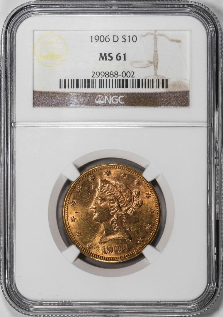 One 1906-D $10 Liberty Head Eagle Gold Coin NGC MS61. NGC Certified.