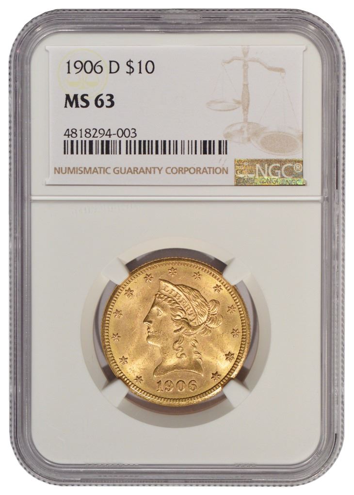 One 1906-D $10 Liberty Head Eagle Gold Coin NGC MS63.