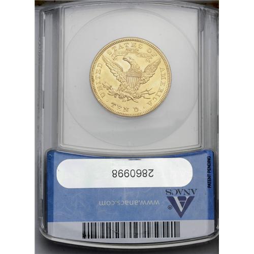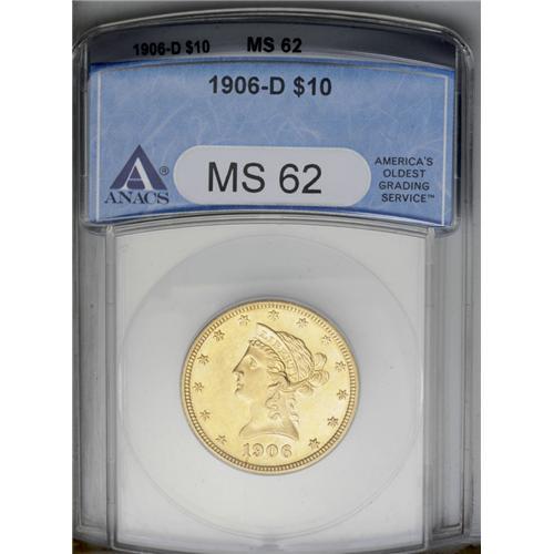 <B>1906-D<$10> MS62 ANACS.</B></I> The only softness apparent on this otherwise boldly defined eagle occurs on two of the upper star centers. Pleasing luster emanates from apricot-gold surfaces that reveal just a few wispy handling marks. Overall, a very nice coin for the grade.