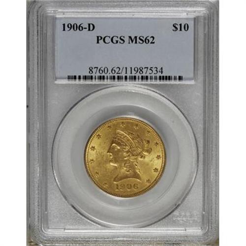 <B>1906-D $10 MS62 PCGS.</B></I> . PCGS Population (826/551). NGC Census: (965/620). Mintage: 981,000. Numismedia Wsl. Price for NGC/PCGS coin in MS62: $495. (#8760)<BR><BR><B>Coin Engraver:</B> Christian Gobrecht<BR><BR><b>Shipping:</b> Coins & Currency (<a target="_blank" href="http://www.heritageauctions.com/common/shipping.php">view shipping information</a>)