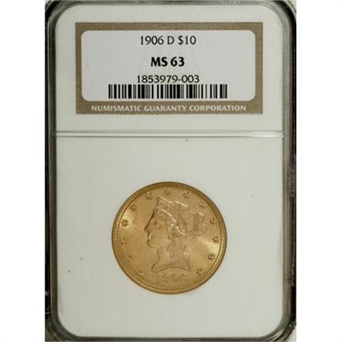 <B>1906-D $10 MS63 NGC.</B></I> NGC Census: (446/148). PCGS Population (358/164). Mintage: 981,000. Numismedia Wsl. Price for NGC/PCGS coin in MS63: $920. (#8760)<BR><BR><b>Shipping:</b> Coins & Currency (<a target="_blank" href="http://www.heritageauctions.com/common/shipping.php">view shipping information</a>)