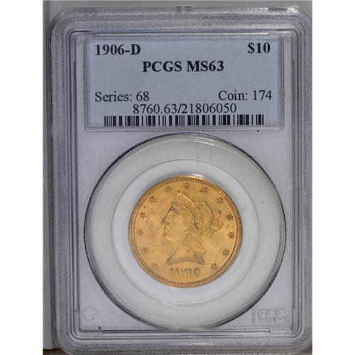 1906-D $10 MS63 PCGS. Nicely struck and lustrous, with