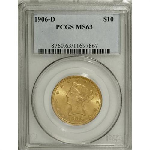 <B>1906-D $10 MS63 PCGS.</B></I> PCGS Population (358/164). NGC Census: (446/148). Mintage: 981,000. Numismedia Wsl. Price for NGC/PCGS coin in MS63: $835. (#8760)<BR><BR><B>Coin Engraver:</B> Christian Gobrecht<BR><BR><b>Shipping:</b> Coins & Currency (<a target="_blank" href="http://www.heritageauctions.com/common/shipping.php">view shipping information</a>\)