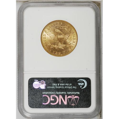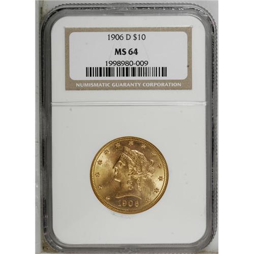 <B>1906-D $10 MS64 NGC.</B></I> Like every branch mint save New Orleans, the Denver Mint struck gold in its first year of operation. This crisply struck and Choice peach-gold eagle is one such example. The cheek is clean, though a significant abrasion is noted in the lustrous right obverse field.<BR><BR><b>Shipping:</b> Coin/Currency (<a target="_blank" href="http://www.heritageauctions.com/common/shipping.php">view shipping information</a>)