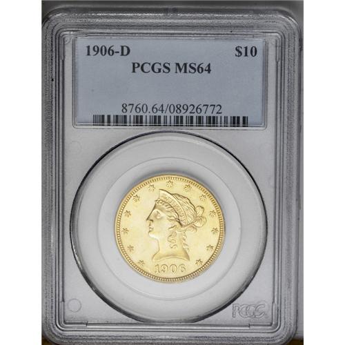 <B>1906-D<$10> MS64 PCGS.</B></I> Blushes of honey toning embrace this fully lustrous and meticulously struck near-Gem. The reverse on its own is fully Gem, and although the obverse has infrequent minor contact, it is also high-end for the MS64 level. After decades of serving as an assay office, the Denver Mint finally began minting coins in 1906. The facility only struck Liberty eagles in 1906 and 1907.