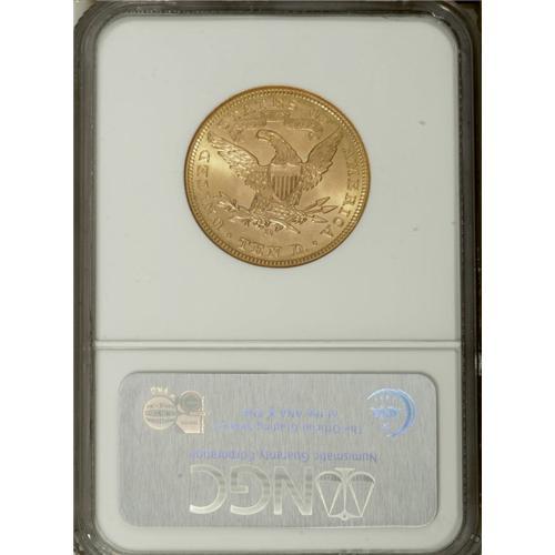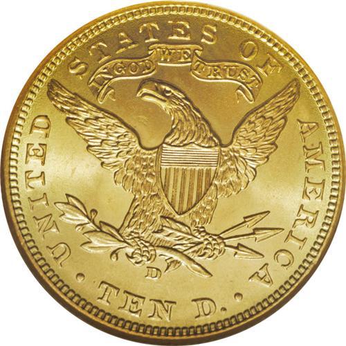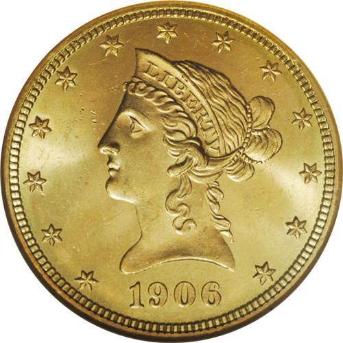 <B>1906-D $10 MS65 NGC.</B></I> The 1906-D ten dollar has a mintage of just under one million pieces, and is relatively common through the MS63 grade level. Near-Gems are somewhat scarce, and Gems are rare. Indeed, NGC and PCGS have certified only around 40 MS65 and finer specimens. The Gem offered in this lot displays pleasing luster and a delightful mix pf peach-gold and mint-green patina. A penetrating strike results in crisp definition on the design elements. Census: 18 in 65, 2 finer (4/07).<BR><BR><b>Shipping:</b> Coins & Currency (<a target="_blank" href="http://www.heritageauctions.com/common/shipping.php">view shipping information</a>)