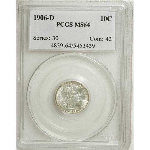 <B>1906-D 10C MS64 PCGS.</B></I> The glistening surfaces are bright, brilliant, and untoned. All of the design elements are sharply struck. With minimal surface marks, this seems like a conservatively graded near-Gem example. Population: 39 in 64, 19 finer (4/07).<BR><BR><b>Shipping:</b> Coins & Currency (<a target="_blank" href="http://www.heritageauctions.com/common/shipping.php">view shipping information</a>)