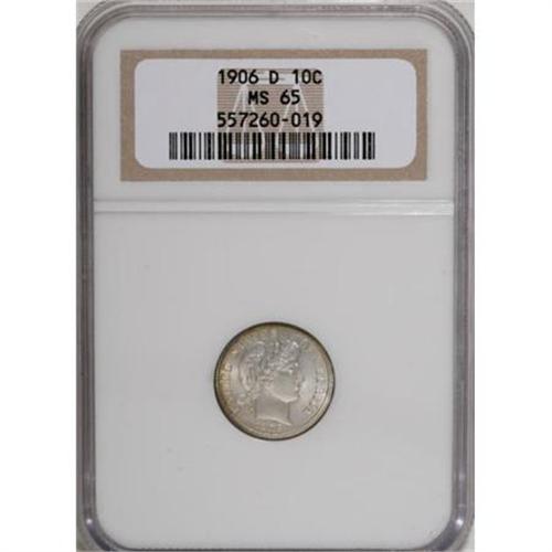 <B>1906-D 10C MS65 NGC.</B></I> Wisps of gold patina visit the obverse border, and gunmetal-blue and antique-gold accent the reverse rim of this lustrous and exquisitely struck Gem. Nicely preserved, and unquestionably scarce in this lofty grade. Census: 17 in 65, 4 finer (1/08).<BR><I>From The Southwest Collection.</B></I><BR><BR><B>Coin Engraver:</B> Charles E. Barber<BR><BR><b>Shipping:</b> Coins & Currency (<a target="_blank" href="http://www.heritageauctions.com/common/shipping.php">view shipping information</a>)
