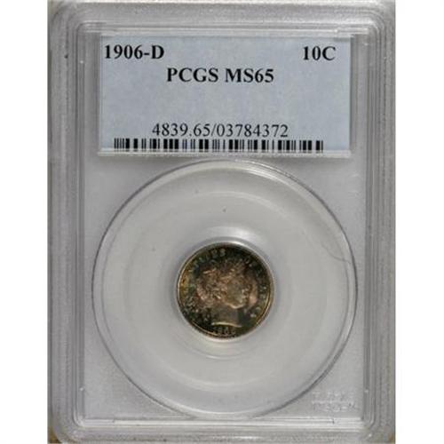 <B>1906-D 10C MS65 PCGS.</B></I> Splashes of apple-green and golden-brown luster grace this lustrous and beautiful Gem. The reverse is essentially pristine, and the obverse is highly pleasing as well. Population: 5 in 65, 16 finer (6/07).<BR><BR><B>Coin Engraver:</B> Charles E. Barber<BR><BR><b>Shipping:</b> Coins & Currency (<a target="_blank" href="http://www.heritageauctions.com/common/shipping.php">view shipping information</a>\)