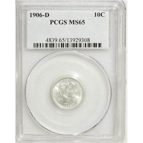 <B>1906-D 10C MS65 PCGS.</B></I> A shining and minimally toned Gem exemplar from the Denver Mint's first dime issue, pleasingly detailed and carefully preserved. PCGS has graded just 16 coins finer (10/07).<BR><BR><B>Coin Engraver:</B> Charles E. Barber<BR><BR><b>Shipping:</b> Coins & Currency (<a target="_blank" href="http://www.heritageauctions.com/common/shipping.php">view shipping information</a>)