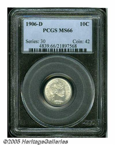 <B>1906-D<10C> MS66 PCGS.</B></I> Lawrence-102. Well struck and generally untoned, with pleasing satin luster and shimmering, unmarked surfaces. This 6 over 6 variety was apparently missed by Breen. Population: 11 in 66, 2 finer (6/05).