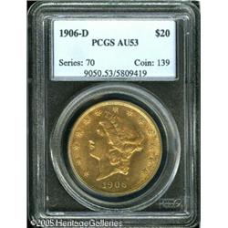 <B>1906-D $20 AU53 PCGS.</B></I> An attractive circulated Double-Eagle that has retained much of its original luster. A great way to own some Denver mint gold. Lot:9408