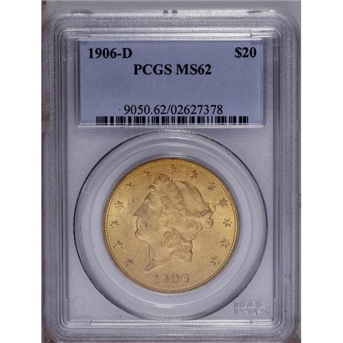 <B>1906-D $20 MS62 PCGS.</B></I> An affordable D-mint issue with rich orange-gold color and frosty luster.
