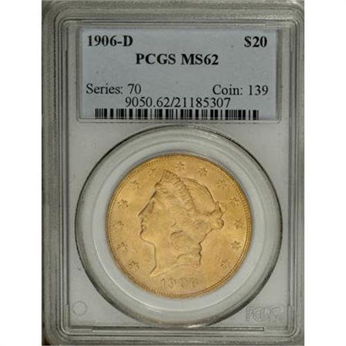 <B>1906-D $20 MS62 PCGS.</B></I> PCGS Population (544/569). NGC Census: (526/403). Mintage: 620,250. Numismedia Wsl. Price for NGC/PCGS coin in MS62: $758. (#9050)<BR><BR><B>Coin Engraver:</B> James B. Longacre<BR><BR><b>Shipping:</b> Coins & Currency (<a target="_blank" href="http://www.heritageauctions.com/common/shipping.php">view shipping information</a>)