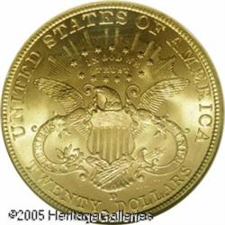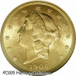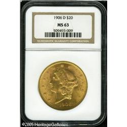 <B>1906-D $20 MS63 NGC.</B></I> This D-mint issue has pleasing apricot-gold patina overlaying lustrous surfaces. The design elements are well struck, displaying nice detail on Liberty's hair and the star centers, and on the eagle's feathers. Some softness is noted on the eagle's neck. The reverse is very well preserved, while the obverse shows some light marks on Liberty's cheek and neck, and in the right and left obverse fields. The '06-D is always a popular coin as it is the first year of issue for this denomination from the Denver mint.<BR><I>From The Richard J. Chouinard Collection of United States Coins, Part Two.</B></I> Lot:9411
