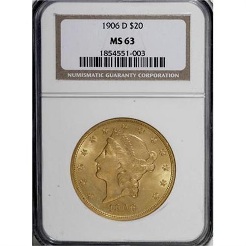 <B>1906-D $20 MS63 NGC.</B></I> The production of double eagles at the Denver Mint began in 1906. The 1906-D is very popular, as it is one of only two years in which Liberty Head twenties were struck at the new mint. Apricot-gold surfaces on this Select example emit glowing luster, and exhibit sharply struck design elements. A few minute obverse marks define the grade.<BR><BR><b>Shipping:</b> Coins & Currency (<a target="_blank" href="http://www.heritageauctions.com/common/shipping.php">view shipping information</a>)