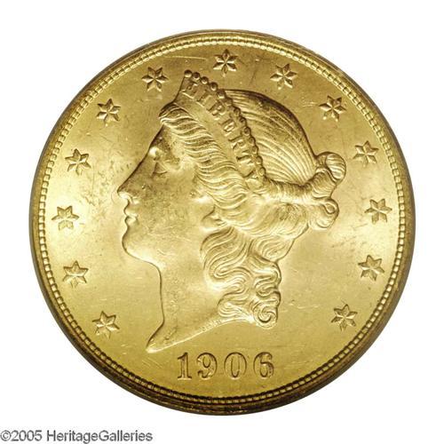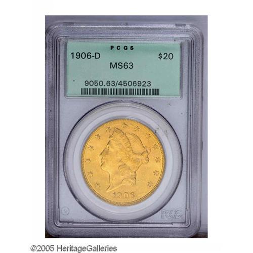 <B>1906-D<$20> MS63 PCGS.</B></I> This meticulously struck example has consistent greenish-gold color and a paucity of mentionable marks. Luster is full and creamy. Encapsulated in a green label holder. One of only two years that the Denver Mint struck Liberty Double Eagles. The Denver Mint began coining operations in 1906, after several decades of serving strictly as an assay office.<BR><I>From The Meads Point Collection.</B></I>