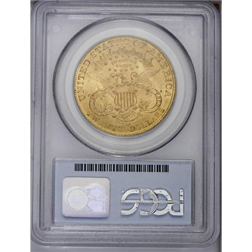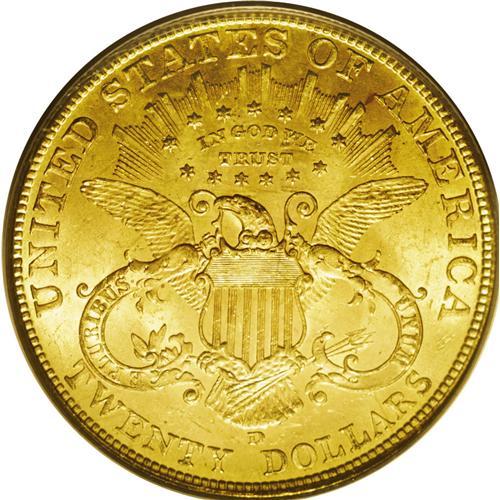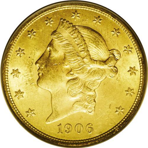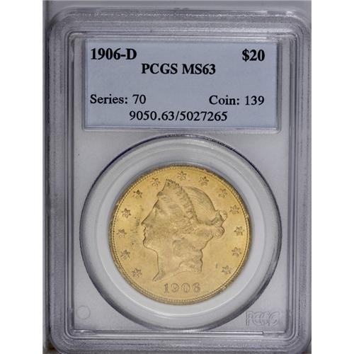 <B>1906-D<$20> MS63 PCGS.</B></I> From the first year of the Denver Mint comes this satiny double eagle, well struck with smooth luster. The honey-mustard fields have some abrasions, as does Miss Liberty's cheek; these are consistent with the grade. Overall, a pleasing example associated with an important year in Mint history.