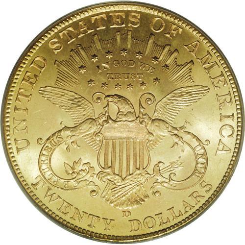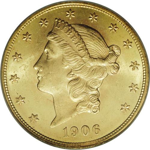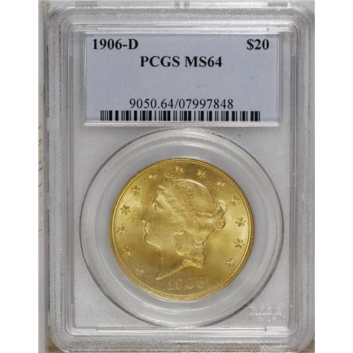<B>1906-D $20 MS64 PCGS.</B></I> Original green-gold and peach toning grace this satiny and refreshingly unperturbed near-Gem. Crisply struck except for STATES and the dentils beneath the date. The introductory Denver Mint double eagle, although its distant predecessor, Clark, Gruber, & Co., had struck twenty dollar pieces of similar design in 1861.<BR><BR><b>Shipping:</b> Coin/Currency (<a target="_blank" href="http://www.heritageauctions.com/common/shipping.php">view shipping information</a>)