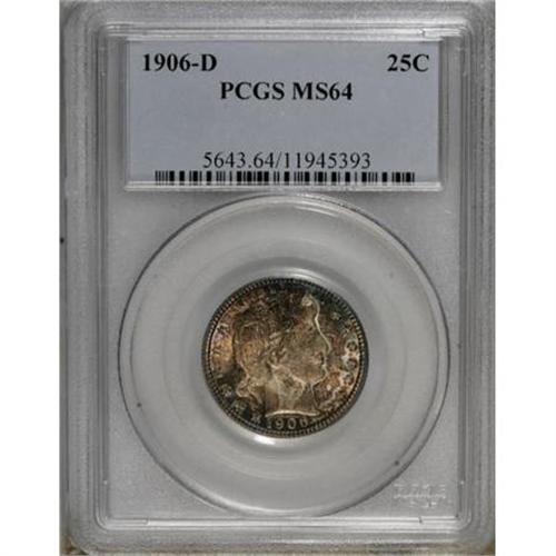 <B>1906-D 25C MS64 PCGS.</B></I> A well struck and satiny Choice coin from the first year of operation for Denver, richly toned with areas of blue, gold-orange, and rose over the obverse. Similar patina appears at the reverse margins, while the center of that side is largely silver-gray. Population: 25 in 64, 25 finer (1/08).<BR><BR><B>Coin Engraver:</B> Charles E. Barber<BR><BR><b>Shipping:</b> Coins & Currency (<a target="_blank" href="http://www.heritageauctions.com/common/shipping.php">view shipping information</a>)
