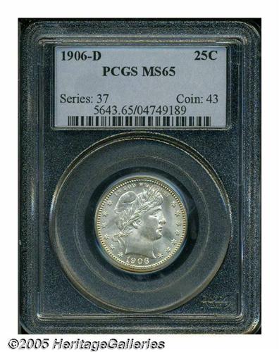 <B>1906-D<25C> MS65 PCGS.</B></I> A lightly toned and lustrous Quarter that has a clean obverse and a seemingly pristine reverse. Well struck, as only the arrow feathers lack full definition. Although readily available in lower circulated grades, this issue is decidedly rare as a Gem. Population: 19 in 65, 6 finer (4/05).