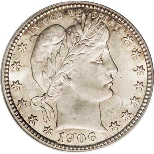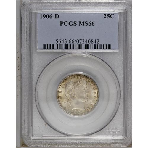 <B>1906-D<25C> MS66 PCGS.</B></I> Crisply struck design elements are noted throughout; only over Liberty's temple and ear and the eagle's right (facing) talons and arrow fletchings are the striking details soft. Shimmering luster and speckled peripheral green and brown patina occur on both sides. The exquisitely preserved surfaces are virtually pristine. Population: 6 in 66, 2 finer (9/06).