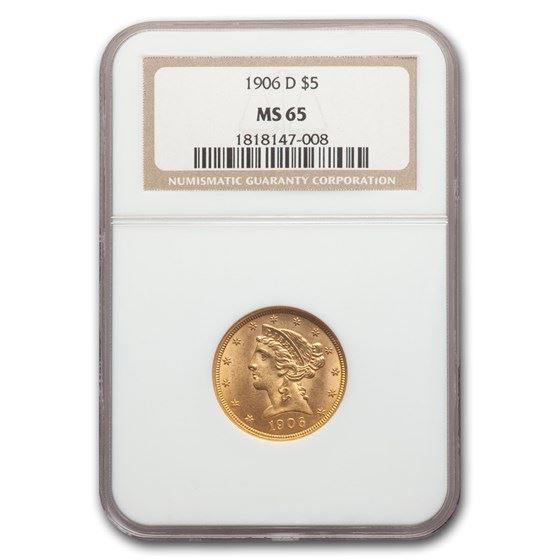 One piece 1906-D $5 Liberty Gold Half Eagle MS-65 NGC