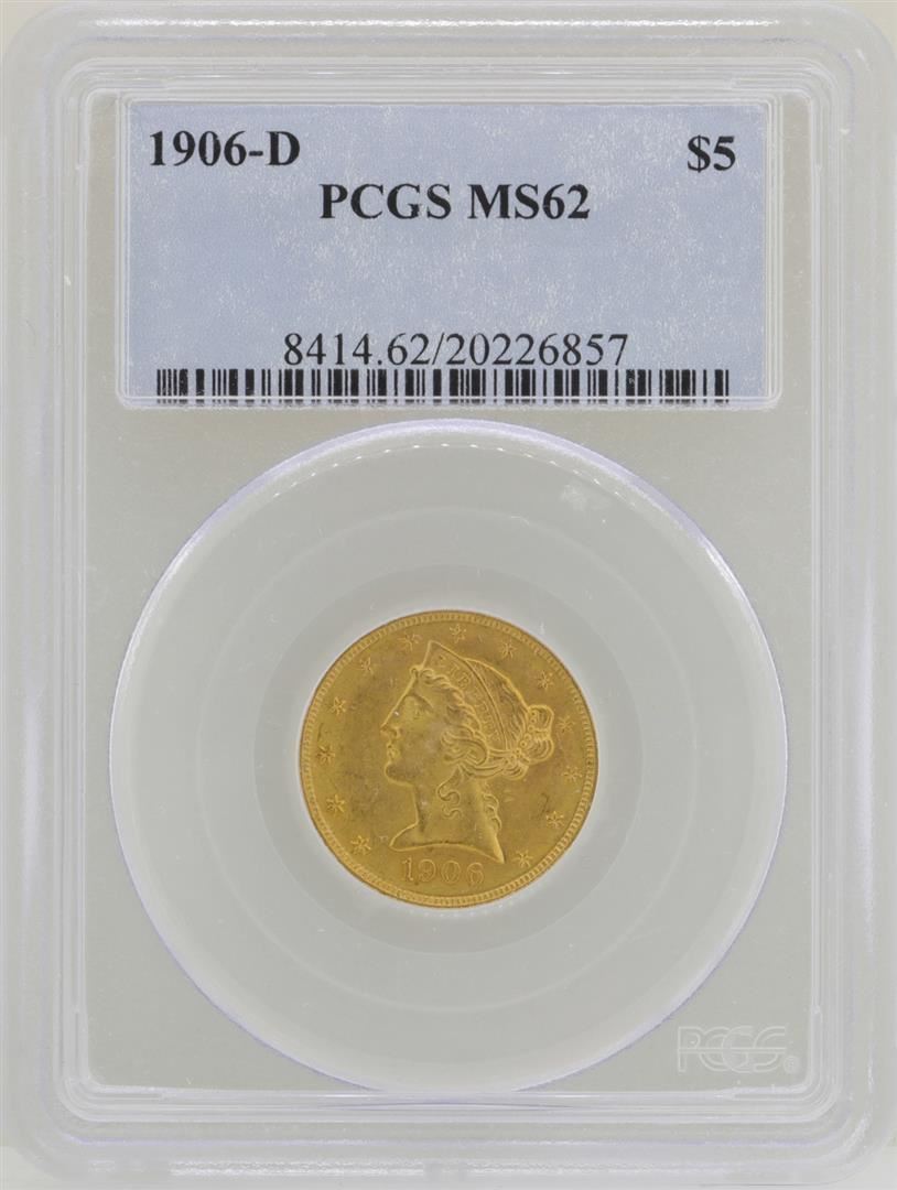 One 1906-D $5 Liberty Head Half Eagle Gold Coin PCGS MS62. PCGS Graded.