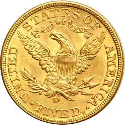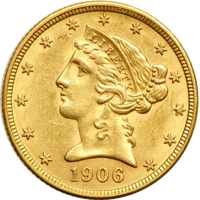 1906-D $5 Liberty. AU-50. Minor obverse scratch is noted.