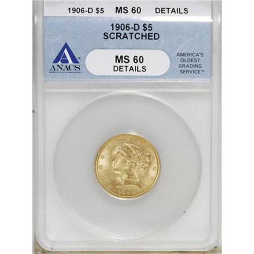<B>1906-D $5 --Scratched--ANACS MS60 Details.</B></I> NGC Census: (31/1769). PCGS Population (102/1518). Mintage: 320,000. Numismedia Wsl. Price for NGC/PCGS coin in MS60: $226. (#8414)<BR><BR><B>Coin Engraver:</B> Christian Gobrecht<BR><BR><b>Shipping:</b> Coins & Currency (<a target="_blank" href="http://www.heritageauctions.com/common/shipping.php">view shipping information</a>)
