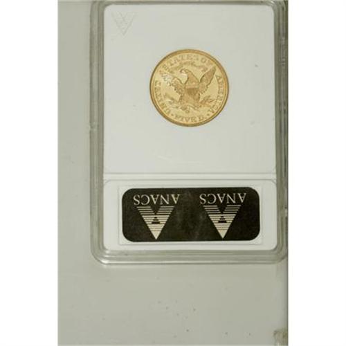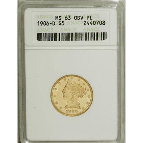 <B>1906-D $5 MS63 Obverse Prooflike ANACS.</B></I> The obverse is prominently mirrored, and the reverse is moderately prooflike as well. Unusual mint-made die lines are present from the tip of the middle arrowhead to the rim between the AM in AMERICA. An interesting and high quality souvenir from the first year of Denver Mint coinage.<BR><I>From The Vanek Collection.</B></I><BR><BR><b>Shipping:</b> Coins & Currency (<a target="_blank" href="http://www.heritageauctions.com/common/shipping.php">view shipping information</a>)