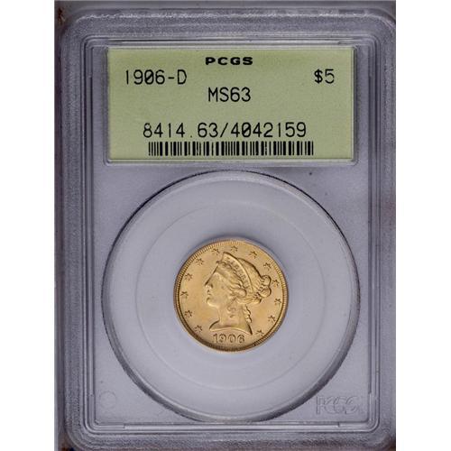 <B>1906-D<$5> MS63 PCGS.</B></I> A nicely struck older holder example. Light luster grazes are barely visible to the naked eye. Struck during the first year of coinage at the Denver Mint.
