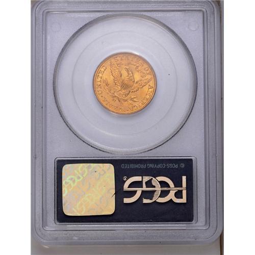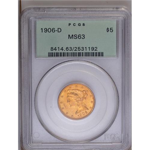 <B>1906-D<$5> MS63 PCGS.</B></I> The same mintmark and much the same design as earlier coins, but this half eagle is from Denver, not Dahlonega. Lustrous and well struck with pale orange-gold surfaces.
