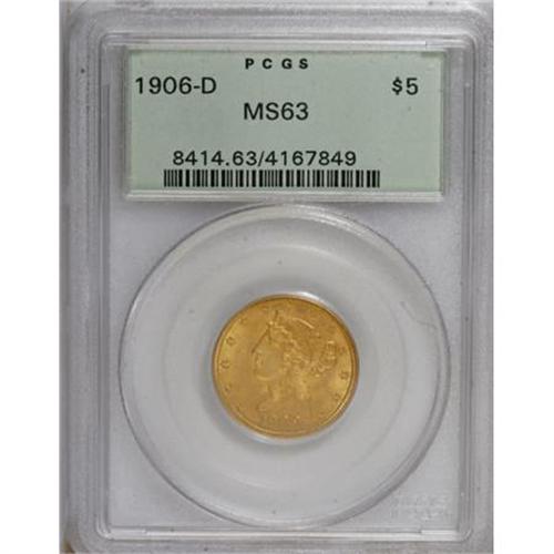 <B>1906-D $5 MS63 PCGS.</B></I> PCGS Population (464/237). NGC Census: (448/349). Mintage: 320,000. Numismedia Wsl. Price for NGC/PCGS coin in MS63: $665. (#8414)<BR><BR><B>Coin Engraver:</B> Christian Gobrecht<BR><BR><b>Shipping:</b> Coins & Currency (<a target="_blank" href="http://www.heritageauctions.com/common/shipping.php">view shipping information</a>)