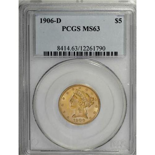 <B>1906-D $5 MS63 PCGS.</B></I> . PCGS Population (469/256). NGC Census: (460/371). Mintage: 320,000. Numismedia Wsl. Price for NGC/PCGS coin in MS63: $1,000. (#8414)<BR><BR><B>Coin Engraver:</B> Christian Gobrecht<BR><BR><b>Shipping:</b> Coins & Currency (<a target="_blank" href="http://www.heritageauctions.com/common/shipping.php">view shipping information</a>)