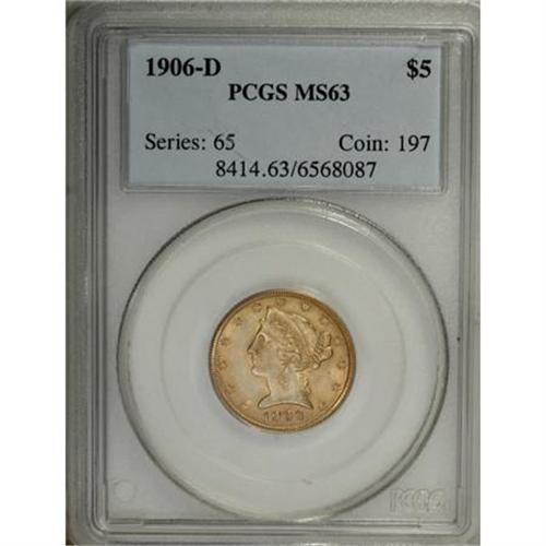 <B>1906-D $5 MS63 PCGS.</B></I> . PCGS Population (469/261). NGC Census: (461/372). Mintage: 320,000. Numismedia Wsl. Price for NGC/PCGS coin in MS63: $1,000. (#8414)<BR><BR><B>Coin Engraver:</B> Christian Gobrecht<BR><BR><b>Shipping:</b> Coins & Currency (<a target="_blank" href="http://www.heritageauctions.com/common/shipping.php">view shipping information</a>)