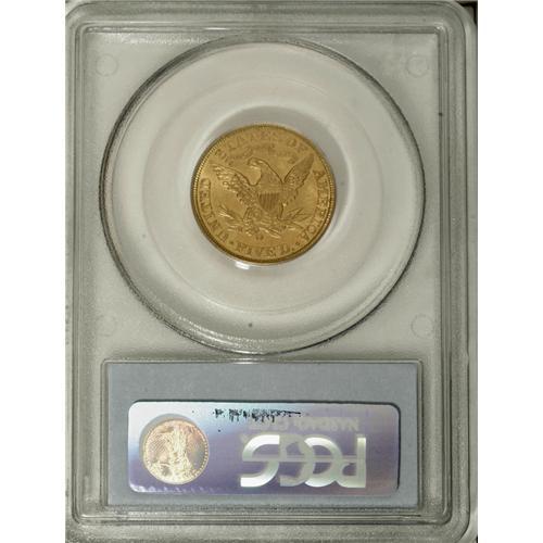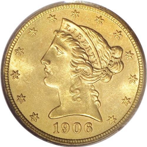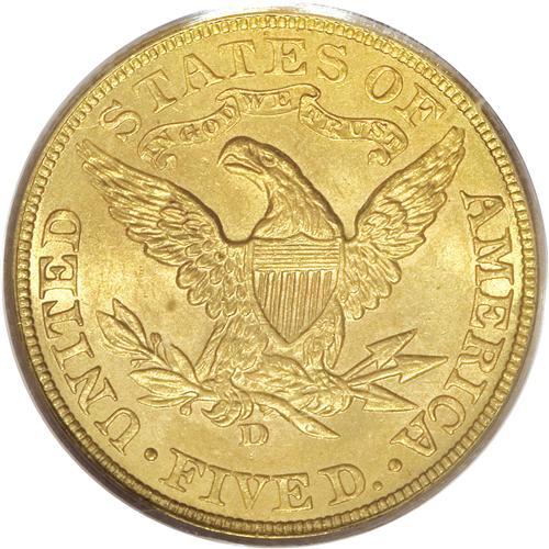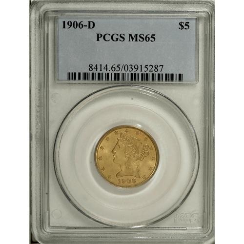 <B>1906-D $5 MS65 PCGS.</B></I> This satiny tan-gold Gem has a smooth appearance, and is well struck save for slight blending on the eagle's neck and right (facing) claw. The introductory Denver Mint issue, with a relatively low production of 320,000 pieces. Population: 26 in 65, 1 finer (2/07).<BR><BR><b>Shipping:</b> Coins & Currency (<a target="_blank" href="http://www.heritageauctions.com/common/shipping.php">view shipping information</a>)